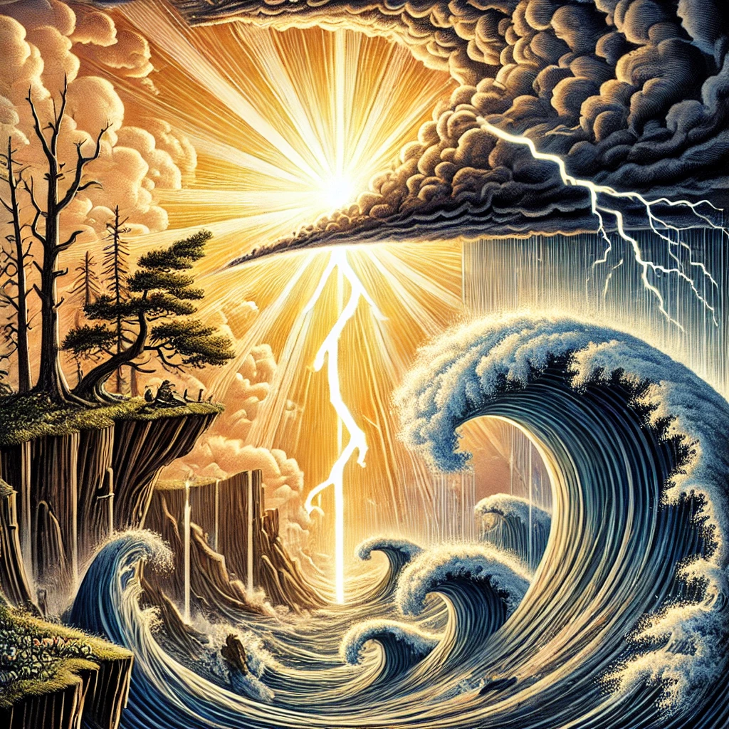 Las estrellas arden porque la gravedad y la presión nuclear se oponen; cuando una vence, la estrella muere. Un relámpago nace porque las cargas positivas y negativas buscan unirse, pero la atmósfera se resiste; cuando la tensión se vuelve insoportable, la descarga ocurre. El viento sopla porque el aire caliente intenta elevarse mientras el aire frío lucha por ocupar su lugar; en su disputa, la corriente se pone en marcha. Un bosque crece porque los árboles buscan la luz mientras la sombra de sus propios hermanos intenta negársela; en esa pugna, la vida se adapta y prospera.